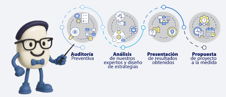 Es por esto que en CAMPA ofrecemos a nuestros clientes una metodología que permite identificar y mapear todo aquello que se debe corregir en la base de datos, simulando una revisión por parte de la autoridad. Una vez dado este primer paso, podremos hacer una planeación estratégica y diseñar un proyecto a medida de las necesidades de la empresa, como lo muestra el siguiente diagrama: